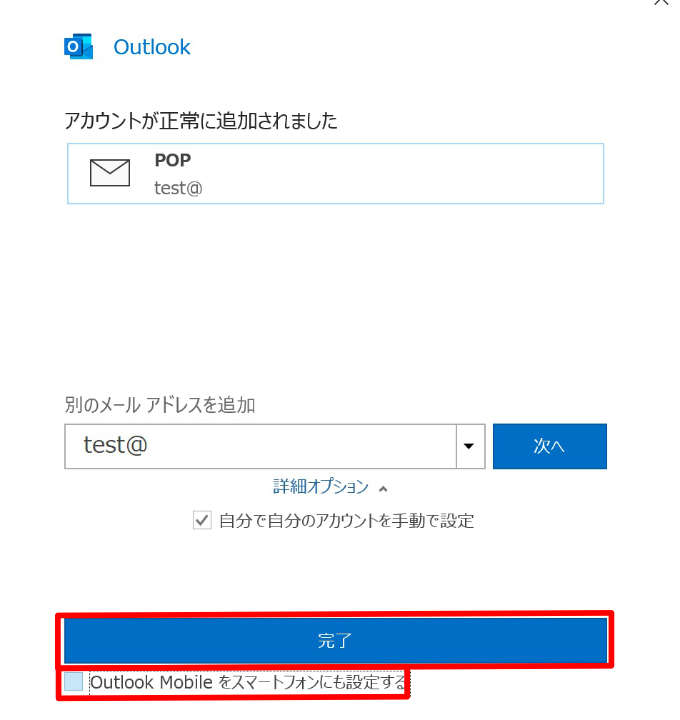 [Outlook Mobile をスマートフォンにも設定する]のチェックをはずして、[完了]をクリックします。