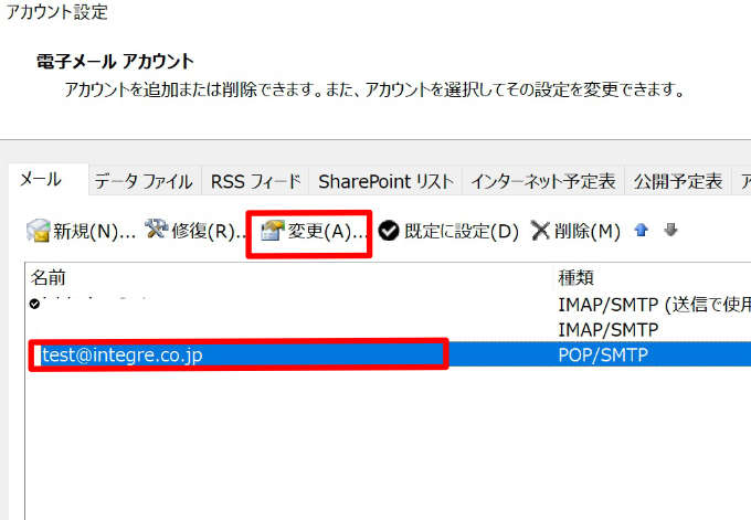 [ファイル]→[アカウント設定]→[アカウント設定]をクリックします。