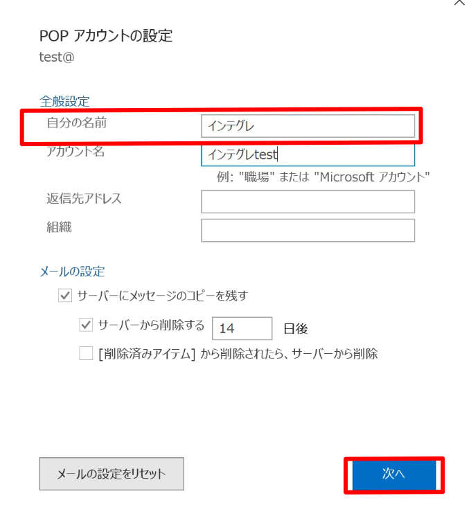 自分の名前に任意の名称(送信先に表示される名前です)を入力し、[次へ]をクリックします。