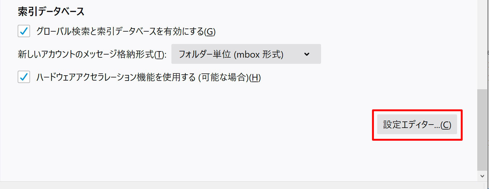 「オプション」の「一般」画面が開かれるので、画面を一番下までスクロールし、 「設定エディター」をクリック