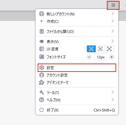Thunderbird を立ち上げ、右上の三本線のマークをクリックし、 メニューリストから「設定」を選択
